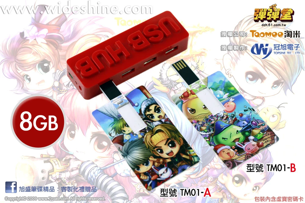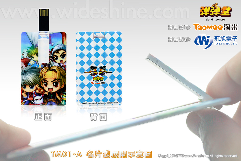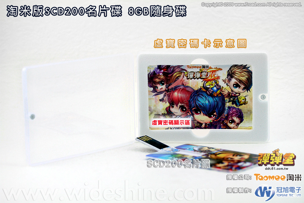 SCD200名片碟為冠旭電子印刷製造之產品,由淘米設計推出一系列彈彈堂限量紀念款,讓彈彈堂的遊戲魅力為您帶來生活樂趣,名片隨身碟外殼可客製化全彩印刷。薄型的外觀設計下,內建8GB的記憶容量,更加搭配著USB 2.0的超高速傳輸介面,無論是個人的私密資料或是公司檔案都可以輕鬆的帶著走!提供您與眾不同的獨特風格。此外,SCD200 尺寸迷你輕巧,重量僅13公克,輕薄之間盡是藏不住的魅力風潮。